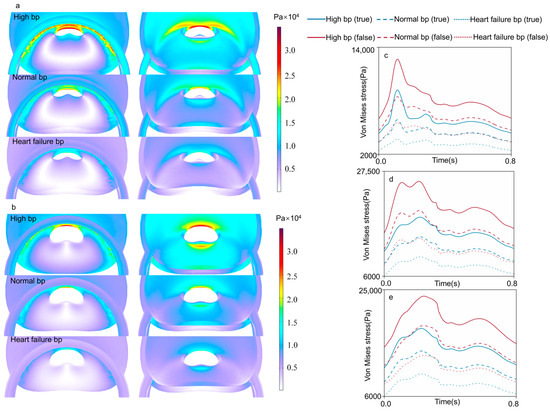 Figure 12a,b illustrate the von Mises stress distribution at the proximal end during systolic peak (left) and mid-diastole (right) for the proximal node and distal node. Figure 12d presents the von Mises stress variation curve over a cardiac cycle on the proximal tear. Since the model’s inlet is at the proximal end, the stress variation is influenced by blood flow direction and sudden changes. However, the overall trend aligns with the global curve in Figure 12c, with only slight differences in the distribution of maximum values, which does not affect the analytical conclusions. Under the three bp conditions, the maximum von Mises stress in the FL was measured at 25,445 Pa, 19,466 Pa, and 13,747 Pa, while in the TL, it was 18,097 Pa, 14,057 Pa, and 9983 Pa. Compared to normal bp, hypertension results in a 30.72% increase in the maximum von Mises stress on the intimal flap.