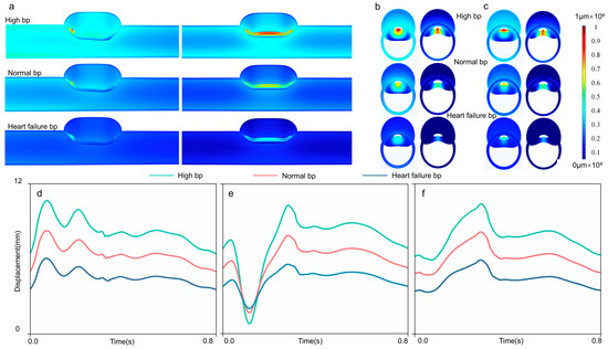 The analysis of three observation points reveals significantly greater deformation near the intimal flap tear than at the central node. As shown in Figure 13b,c, they correspond to the deformation cloud maps of the proximal node and the distal node, respectively. Under identical bps, the deformation differences among the points are relatively small. However, under varying bps, though the deformation trends are consistent, noticeable differences in magnitude emerge, as depicted in Figure 13d–f. Specifically, focusing on the central point of the intimal flap (referencing Table 5 and Figure 13e), the maximum deformation occurs at 0.283 s, with values of 10.2920 mm, 7.8678 mm, and 5.5504 mm under the three bp conditions. This indicates a 30.81% increase in deformation under high bp compared to normal bp. These findings robustly demonstrate a positive correlation between intimal flap deformation and bp fluctuations.