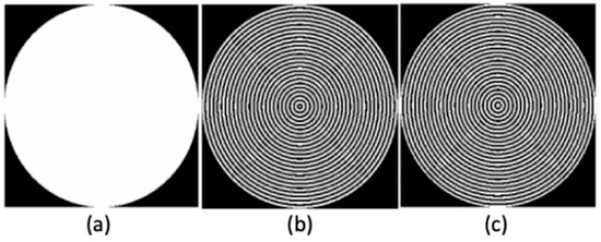 Filtering masks used in the radial Hilbert transform step. (a) A binary disk mask applied in the frequency domain to localize the transform. (b) Real component () of the radial Hilbert mask. (c) Imaginary component () of the mask.