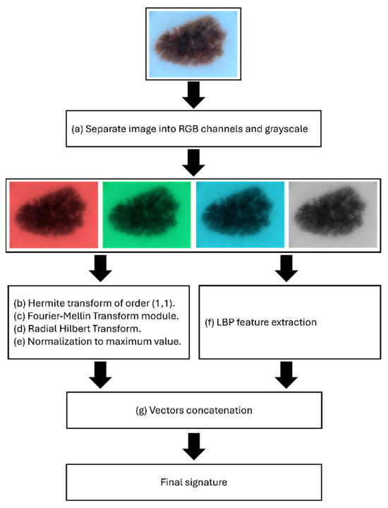 Workflow of the proposed hybrid transform-based feature extraction method. (a) RGB and grayscale channel separation of skin lesion images. (b) The Hermite transform of order (1,1) is applied to capture localized spatial features. (c) Computation of Radial Fourier–Mellin transform for translation and scale invariance. (d) Application of the radial Hilbert transform for rotational invariance. (e) Normalization of transform-based signatures. (f) Extraction of Local Binary Pattern (LBP) features for texture representation. (g) Final signature generation through concatenation of transform and LBP descriptors.
