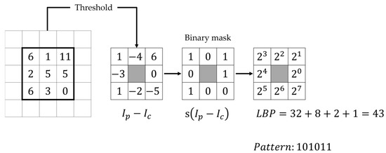 LBP is a simple yet effective descriptor that captures textures, edges, corners, spots, and flat regions. For each pixel block, the intensity of the eight surrounding pixels is compared to the intensity of the central pixel, which serves as the threshold. If the intensity of a neighboring pixel is greater than or equal to the central pixel, its position is assigned a value of 1; otherwise, it is assigned 0. After comparing all pixels, a binary sequence is formed.