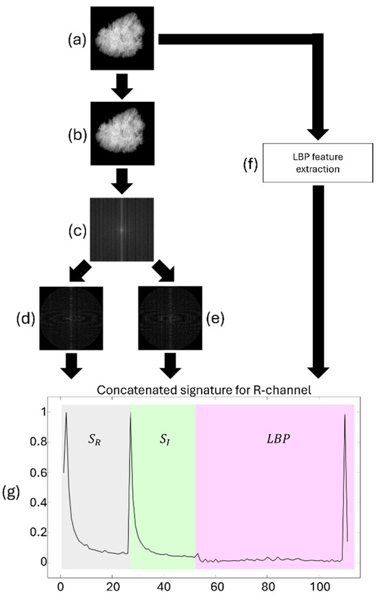 End-to-end feature extraction steps for a skin lesion image’s red (R) channel. (a) Original R-channel input. (b) The result of the Hermite transform of order (1,1) highlights localized image features. (c) Modulus of the Fourier–Mellin transform for scale and translation invariance. (d) Real part and (e) imaginary part of the radial Hilbert transform used to ensure rotational invariance. (f) LBP feature extraction from the R-channel. (g) The final one-dimensional signature vector was obtained by concatenating all feature descriptors.