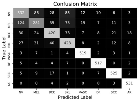 We randomly selected images for classification. The classes in the dataset were balanced, with 1840 images used for each type of skin lesion to prevent classification bias. Then, the deep learning model described in the “Classification” section was trained using a data split of 30% for testing and 70% for training.