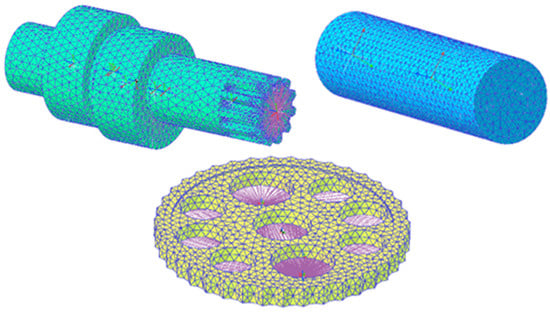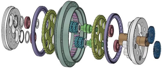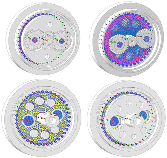- Based on the applied constraints, the mesh function in RecurDyn is utilized to discretize the pin wheel, crankshaft, and cycloid wheel. Material properties are assigned to the corresponding parts, and the patch function is employed to establish surface contact, thereby completing the flexible body conversion. Finally, the rigid–flexible coupling model of the RV reducer is obtained as shown in Figure 5.