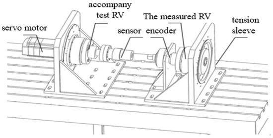 To validate the reliability of the virtual prototype methodology, it is essential to ensure that the transmission accuracy values obtained from the virtual prototype methodology for the RV-40E reducer are closely aligned with the transmission errors measured by the actual prototype test bench. Consequently, a test bench was constructed, and several groups of parts, drives, loads, and other samples were selected for transmission error measurement. The test bench primarily consists of servo motors, torque sensors, a circular grating encoder, etc. The experimental test bench, as illustrated in Figure 7, consists of the following components: two mounting brackets are fixed on the experimental platform, with an accompanying RV-40E reducer, torque sensor, and servo motor mounted on the left bracket, while the tested RV-40E reducer and encoder are installed on the right bracket. The input shaft of the tested reducer is likewise secured to the bracket. Upon activation of the servo motor, transmission error values under varying load conditions can be detected.