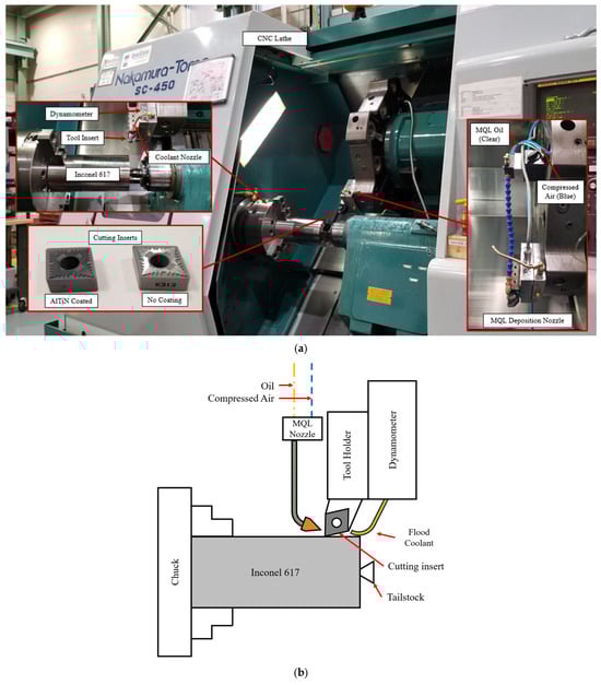 Kamata and Obikawa investigated the influence of high-speed MQL finish-turning on Inconel 718 [9]. This work investigated three tool coatings that were used to machine Inconel 718 under MQL. The authors found that the air pressure provided in MQL deposition had an impact on tool life, with higher air pressures causing a decrease in tool life, the inverse of their results when machining carbon steel [10]. From this, it is seen that the effectiveness of MQL is material-dependent and must be investigated further for different materials such as Inconel 617.