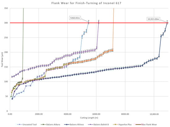The tool lives for the uncoated tool and the tested tool coatings are depicted in Figure 2, which shows the flank wear measured for the duration of its entire tool life until it reaches 300 µm. From the experiment, the AlTiN PVD-coated tool can be seen to nearly double the lifespan of the cutting tool, as well as generating a very gradual increase in tool wear in the steady-state region of the tool. The rate of flank wear in this steady-state region was measured to be 6.72 µm/km of cutting. This is a 75.89% improvement from the uncoated tool’s rate of flank wear of 27.87 µm/km of cutting. The observed improvement in tool life using a monolayer coating is much greater than those presented in similar machining studies performed on Inconel 718, where the tool life was only increased by 40% at high speeds [46] or at similar speeds, which tended to reduce the tool’s life [27]. This suggests that monolayer coatings are most effective in machining Inconel 617. The results indicate that the presence of a hard protective coating is effective in reducing the abrasion caused by the hard workpiece due to the slow progression of flank wear. Of the tested coatings, the AlTiN coating by Balzers provided the longest tool life. It was from this test that the PVD AlTiN coating was chosen to conduct further experiments.