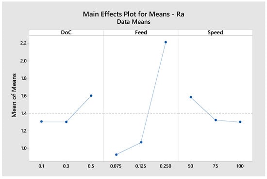 Main effect plot for depth of cut, feed rate, and cutting speed on mean of means for average roughness.