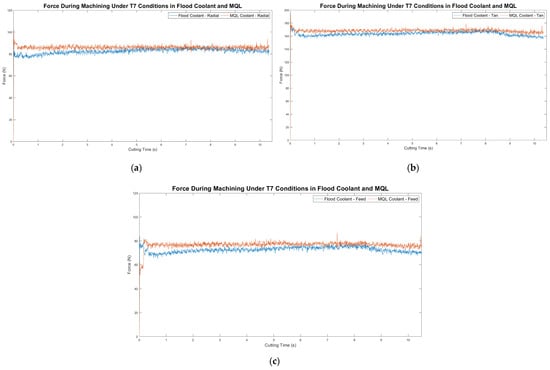 In Study C, the cutting force data were collected to analyze the resultant cutting forces in MQL compared to its flood coolant counterpart to detect if the cutting forces had an impact on the surface quality. Upon analyzing the data as shown in Figure 4, it was observed that the forces acting in both the MQL and flood coolant are of a similar magnitude, having a maximum percentage difference of 5.77%, which occurred in the feed direction of the T7 tests. These results suggest that the cutting forces caused by varying the coolant method have little relation to the surface quality of each test and did not impact the following three sub-studies.