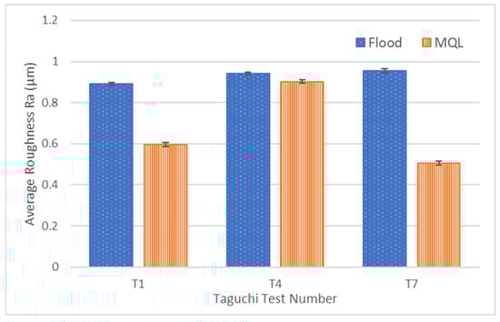 Figure 5 illustrates the measured roughness for the generated surfaces in T1, T4, and T7 cutting conditions, comparing the coolant deposition methods. It can be observed that across all tests, MQL generated a lower average surface roughness compared to the flood coolant regardless of the cutting parameters used. The use of MQL in this process yielded up to a 47% improvement in the average roughness of the machined Inconel 617 workpiece. This aligns with studies performed on Inconel 718 where MQL greatly reduced the surface roughness of the machined surface in comparison to the flood coolant or dry conditions [9,22].