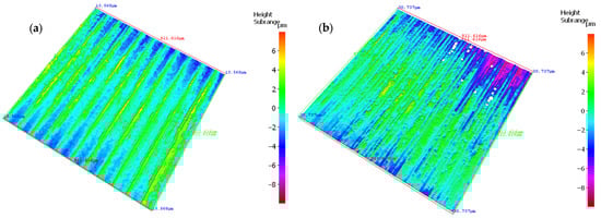 Surface topography maps of the machined surface using T7 parameters and (a) the flood coolant and (b) MQL.