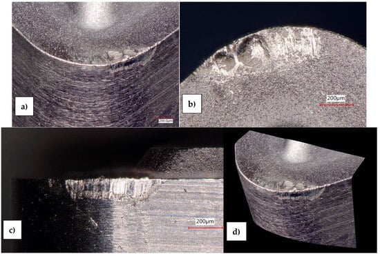 Tool wear also leads to a poor surface finish caused by the adhesion of the workpiece material onto the exposed substrate of the tool, causing a built-up edge (BUE) to form [25]. This BUE is a hardened piece of Inconel that becomes welded onto the tool edge due to the high pressures and temperatures that occur at the tool nose caused by the cut. BUE formation may result in the overcutting of the workpiece, leading to geometrical inaccuracies and large gouges in the generated surface. BUE breakage will leave deposits on the surface and form large burrs that cause a poor surface finish. This breakage can also lead to tool fracture, chipping, and the rapid failure of the tool and machined part as the adhered material may become harder than the tool substrate itself [26,27,28].