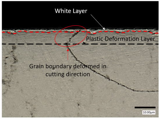 A polished and etched sample of the cross-section of the machined Inconel 617 under T7 conditions (DoC = 0.5 mm, feed = 0.075 mm/rev, cutting speed = 75 m/min) showing the grain boundary deformation and presence of a white layer caused by machining.