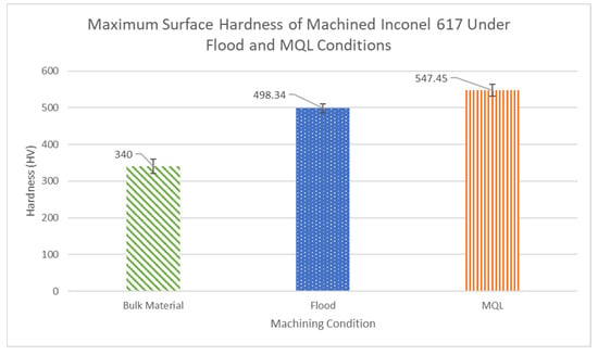 It was observed that in every case, MQL generated a greater level of work hardening in the immediate subsurface, with HV values between 495 and 550 HV, while the flood coolant generated HV values between 410 and 500 HV. Due to the location of MQL mist deposition, directed towards the rake face of the tool and generated chip, the flank face had limited cooling and resulted in higher friction and pressure between the tool and the generated surface, causing the high level of initial work hardening. However, in studies performed on MQL machining of other Inconel grades, MQL generated lower initial hardnesses compared to flood cooling [21,49]. This phenomenon may be caused by the MQL deposition location directing the oil towards the flank face, as explained in their methodology.