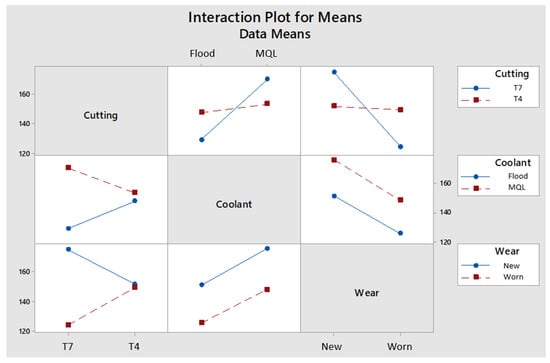 The coolant deposition method and the level of tool wear were found to have the largest influence on the level of work hardening recovery, whereas the cutting parameters used had a minor impact in comparison (Figure 10 and Figure 11, through the Taguchi design of the experiments). The main effect plot shows that MQL has a higher mean strength than the flood coolant in the experiments. New tools showed a higher mean strength than the worn tools. However, the impact of the method of coolant deposition on the work hardening is also influenced by the cutting parameters used as shown in the interaction between these factors. Additionally, the interaction plot in Figure 11 shows that the parameters have an impact on each others’ relationship to the work hardening recovery with the exception of coolant use and tool wear, which are independent of each other.