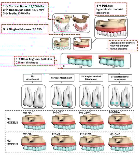 Four finite element models were generated based on the type and placement of attachments on the upper first and second molars. These models included the following: no attachment (NA), a vertical attachment (VA), a 25° angled vertical attachment (25VA), and a double horizontal attachment (DHA). Additionally, two trimline configurations were considered: the M0 group featured a trimline ending at the gingival margin, while the M2 group included a trimline extending 2 mm above the gingiva. This design matrix resulted in a total of eight models (Figure 1).