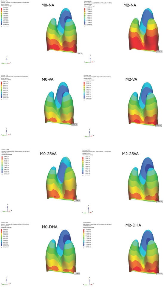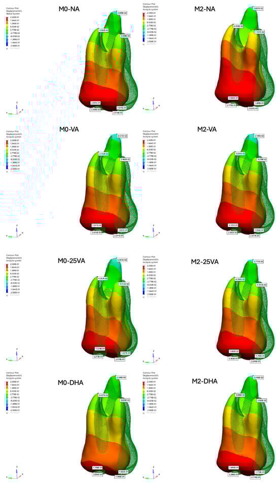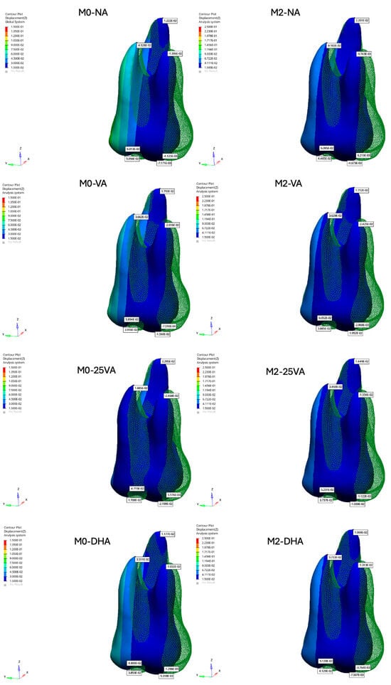 In the M2 models, vertical displacement was more homogeneously distributed across all surfaces of the maxillary first molar in the M2-25VA and M2-DHA models, indicating improved vertical control (M2-25VA: MBCT: −0.08077 mm, DBCT: −0.02619 mm; M2-DHA: MBCT: −0.07410 mm, DBCT: −0.03604 mm) (Figure 5).