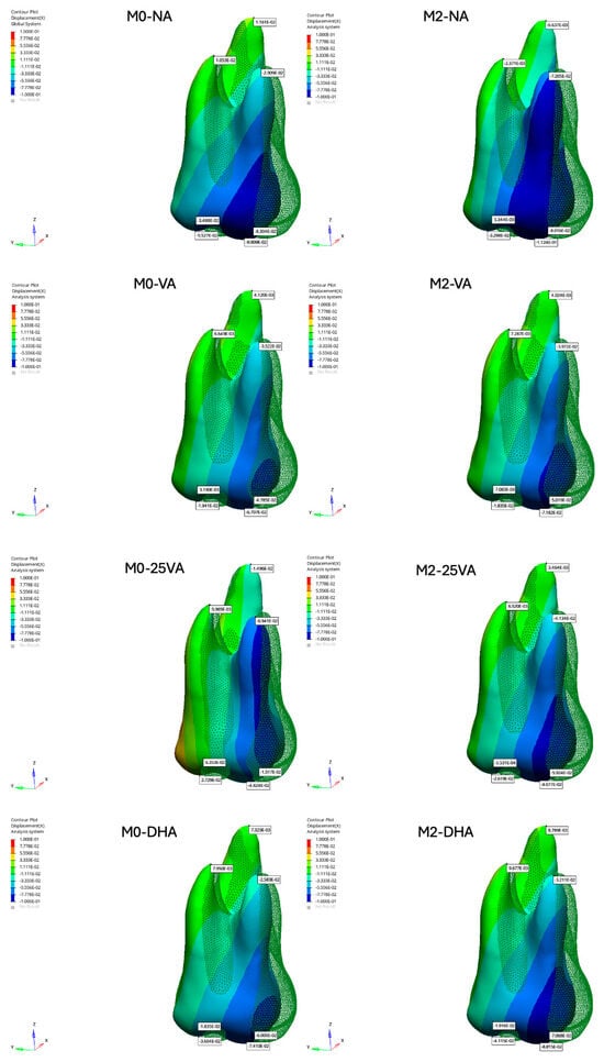 In the M2 models, the highest buccal crown displacement on the X-axis was found in the M2-NA model (MBCT: −0.112 mm), whereas M2-VA and M2-25VA exhibited reduced crown movement (M2-VA: −0.071 mm, M2-25VA: −0.080 mm). Regarding root movement, the greatest buccal root displacement was observed in M2-NA (DBRA: −0.002 mm) (Figure 3).