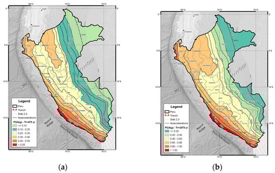 Seismicity hazard map. (a) Tr = 475 years; (b) Tr = 2475 years [].