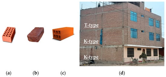Representative confined masonry dwelling in the Lima Metropolitan Area. (a) K-type brick, (b) S-type brick, (c) T-type brick, and (d) one of the representative dwellings.