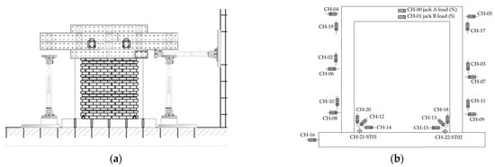 The horizontal jacks were anchored to the reaction wall and linked to a steel frame assembly to facilitate load transfer, as illustrated in Figure 4. Similarly, the vertical jacks were supported by the reaction floor and connected to the steel assemblage. The measurement system comprised load cells integrated into the jacks (CH-00 to CH-03) and LVDT displacement transducers positioned on the specimen (CH-04 to CH-20). All sensors and load cells were connected to a universal scanning system, the Tokyo Sokki TDS-530 data logger, as depicted in Figure 4.