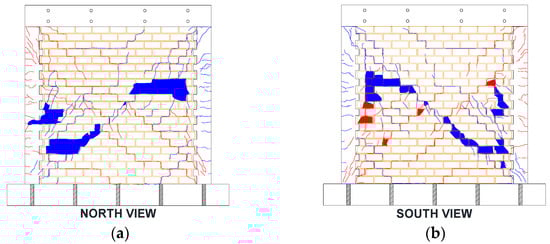 Digitized crack pattern of the masonry wall using AutoCAD software: (a) north-facing view; (b) south-facing view.