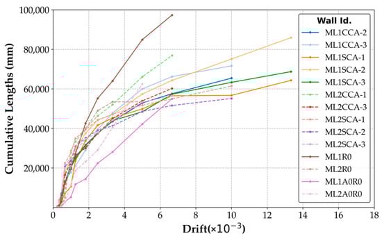 After reaching the target drift, a photographic image corresponding to that specific drift level is captured. Subsequently, to document crack propagation, the damage observed on the walls is digitized using V.72.0.0 AutoCAD 2025.0.1 software. The cracks are represented as polylines, allowing for precise measurement of their lengths at each target drift, as shown in Figure 5. Additionally, the relationship between crack length and the corresponding drift for the specimens presented in Table 1 is illustrated in Figure 6.