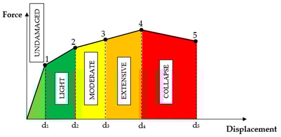 The damage levels associated with this index are categorized as Undamaged or Slight, Light, Moderate, Extensive, and Collapse, as illustrated in Figure 7. It is important to note that the ultimate stage is defined as 80% of the maximum restoring force. Beyond this threshold, confined masonry walls are considered to have undergone total collapse. The collapse category indicates that while the walls may still support gravity loads, they have lost their lateral load-bearing capacity.