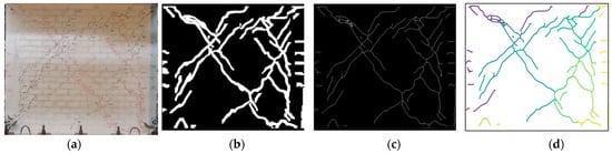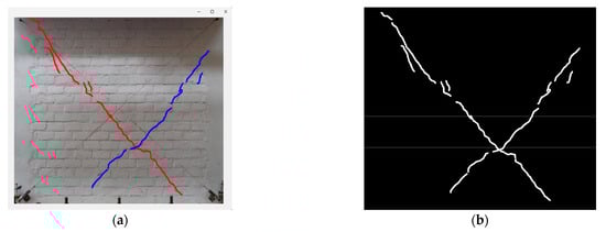 To facilitate the labeling and cataloging of cracks, a custom software tool named Crack Labeler version 1.0 [] was developed using Python Version 3.8 []. This application features a user-friendly graphical interface that enables operators to open images of wall specimens and manually draw lines over the regions where cracks are observed. Each annotated line is recorded along with a color label indicating the direction of the hydraulic actuator’s action: red for pushing and blue for pulling. In this context, pushing refers to a shear stress flow along the blue-marked cracks, whereas pulling corresponds a shear stress flow along the red-marked cracks as show in Figure 5 and Figure 8a. Once the labeling process is completed, the software generates both a graphical mask and a corresponding numerical record in a separate file. This binary mask can then be passed to a skeletonization algorithm for finer delineation of the cracks, enabling a more precise and streamlined analysis of crack trajectories in subsequent stages of the research.