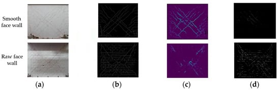Current state-of-the-art applied to tested wall images. (a) Tested image. (b) DeepCrack. (c) Crack Segmentation. (d) Pavimendonia.