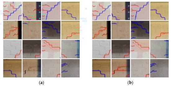 Crack segmentation. (a) Batch of labeled images; (b) batch of corresponding inferenced images.