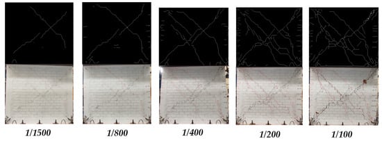 In the laboratory tests, a manual crack identification process was conducted for each damage level of every wall specimen. Initially, existing cracks were marked directly on the physical specimens using distinct colors. Subsequently, photographs capturing both the wall specimens and the marked cracks were digitized using V.72.0.0 AutoCAD 2025.0.1 software, ensuring the images were accurately scaled to the actual dimensions of the specimens.