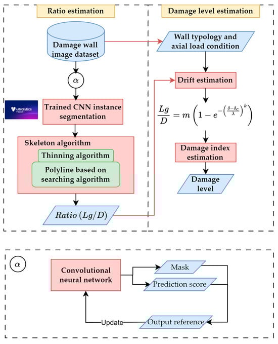Machine learning and deep learning techniques, particularly convolutional neural networks (CNNs), have been widely applied to identify patterns in structural response data, enabling rapid post-earthquake damage assessment and accurate prediction of building safety conditions [,,]. The detection and assessment of structural damage in confined masonry walls after an earthquake is a critical challenge in structural engineering. Recent advances in deep learning techniques have significantly improved the identification and quantification of cracks in various infrastructures, including buildings, pavements, and bridges. The application of CNNs has proven to be highly effective in automating crack detection, with methodologies leveraging both traditional CNN architectures and modern transformer-based networks. For instance, U-Net has been successfully applied to detect cracks in concrete surfaces, demonstrating robustness under different lighting conditions and complex backgrounds []. Similarly, deep learning approaches have been integrated with machine learning techniques to enhance the segmentation of bricks and the detection of cracks in masonry walls, improving automation and accuracy []. Moreover, transformer-based networks such as CrackFormer have been introduced for fine-grained crack detection, achieving state-of-the-art results by leveraging attention mechanisms and improving contextual feature extraction []. More recently, Hacıefendioğlu et al. [] developed the CAM-K-SEG model, integrating Grad-CAM visualization and K-means clustering to automatically detect and segment cracks in historical masonry structures, outperforming traditional segmentation models like U-Net. Furthermore, Lazaridis and Thomoglou [] proposed a machine learning-based ensemble approach combining XGBoost and CatBoost algorithms to accurately predict the shear capacity of TRM-strengthened unreinforced masonry walls, demonstrating the potential of machine learning for structural performance evaluation. These advancements highlight the growing role of deep learning in structural health monitoring, offering reliable and scalable solutions for post-earthquake damage assessment in masonry structures.
