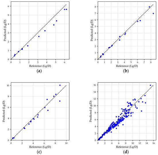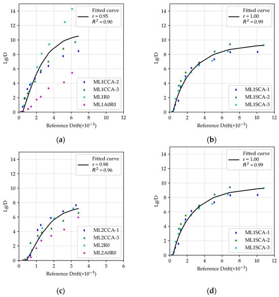 Comparison of predicted and reference ratios. (a) ML1SCA-1; (b) ML1A0R0; (c) ML2CCA-3; and (d) all specimens.