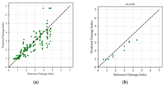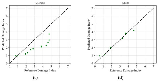 To demonstrate the accuracy of the damage index estimates, Figure 17 compares the reference and predicted damage index for four selected cases. Figure 17a contains the complete dataset, including all walls and their deformation states, resulting in an RMSE of 0.71. This indicates that, on average, predictions closely align with the 1:1 reference line, representing an acceptable estimation of the damage index. Figure 17b contains the case of wall ML2A0R0, whose RMSE error is 0.61, closely matching the average RMSE calculated across all walls (see Table 8). Figure 17c illustrates the results for wall ML1A0R0, exhibiting the highest RMSE (1.35) among the 14 walls evaluated. This elevated error can be attributed to the distinct cracking pattern observed in ML1A0R0, characterized predominantly by brick cracks that concentrated damage into fewer, larger cracks. Figure 17d shows the results for wall ML2R0, which achieved the lowest RMSE value (0.25) within the sample analyzed.