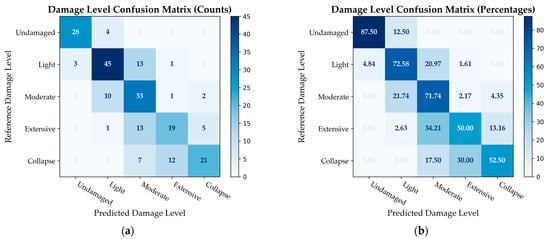 Confusion matrices of damage levels. (a) Number of occurrences. (b) Relative proportions.