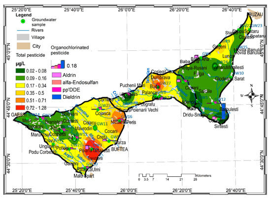 The spatial distribution of the total pesticide concentration in the groundwater from the studied areas is presented in Figure 2.