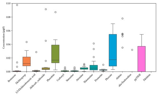 Box-plot diagram of pesticide concentrations (µg/L) in groundwater samples.