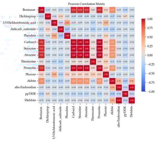 To assess the relationships between pesticides present in the groundwater samples, a Pearson correlation analysis was performed and the obtained correlation matrix is presented in Figure 4.
