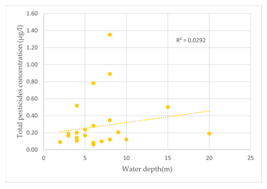 There is no significant relationship between the water depth and total pesticide concentration (Figure 5), as indicated by the very low R2 value (0.0292). Most data points, clustered between 2 and 10 m in depth, exhibit relatively low pesticide concentrations, generally below 0.4 µg/L. A few outliers, such as the point near 1.4 µg/L, are observed but appear to be isolated incidents. These may suggest localized contamination, potentially linked to intensive pesticide use in nearby agricultural areas.