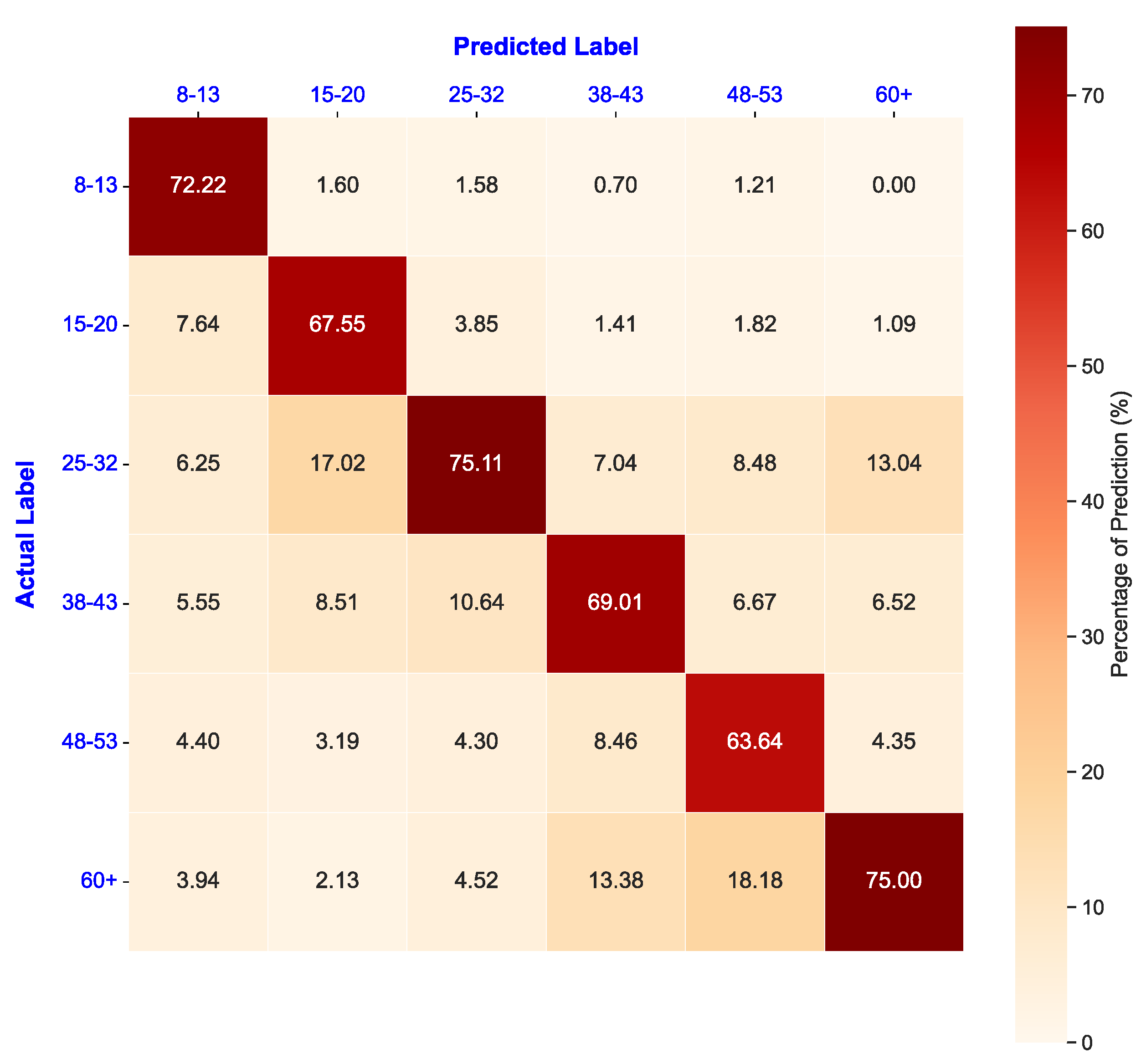 | Age Groups | 8–13 | 15–20 | 25–32 | 38–43 | 48–53 | 60+ | Average |
