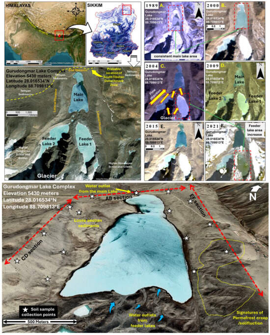 The formation of new lakes and water accumulation in glaciated regions of Sikkim, including the area near Gurudongmar Lake, have become apparent in recent decades. A notable new lake growth has been observed in the Gurudongmar Lake complex behind Feeder Lake 1 during this period (Figure 9F,G). While mass movements into lakes are a primary cause of GLOFs, they do not always result in the breaching of the lake [54,55].