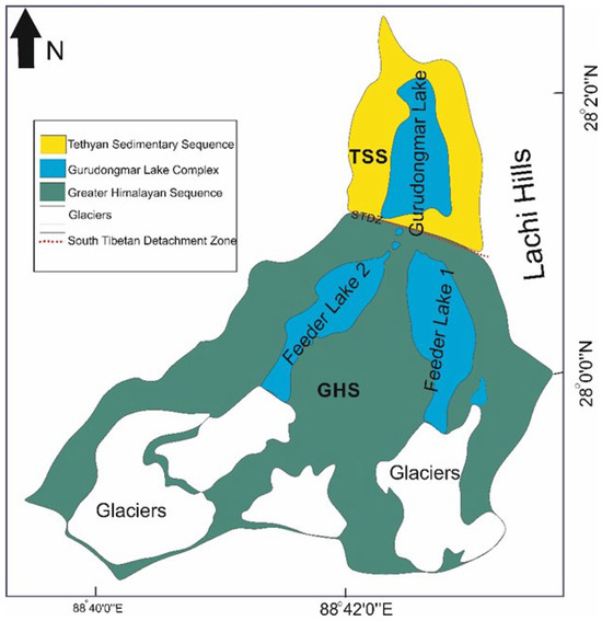 The geological setting of Gurudongmar Lake (Figure 2) is defined by its location within a transition zone between the Greater Himalayan Sequence (GHS) to the south and the Tethyan Sedimentary Sequence (TSS) to the north, separated by the South Tibetan Detachment Zone (STDZ). The lake lies within a proglacial context, where the retreat of glaciers has left behind a combination of moraine deposits and bedrock features. The sediments surrounding the lake primarily consist of silty sand, either from moraine deposits or debris transported by water. The lithology of the TSS, ranging from Cambrian to Cretaceous in age, includes ferruginous sandstone, limestone, siltstone, and shale, with fossils like graptolites and brachiopods embedded within these rocks. Though generally un-metamorphosed, some regions exhibit low-grade metamorphism, particularly in the formation of biotite-mica schist and psammites. The TSS is bounded by the STDZ [29], which separates it from the low- to medium-grade metamorphic rocks of the GHS to the south [30,31]. In the east, the lake is bordered by the Lachi Hills, consisting of quartzite, shale, and pebble beds.