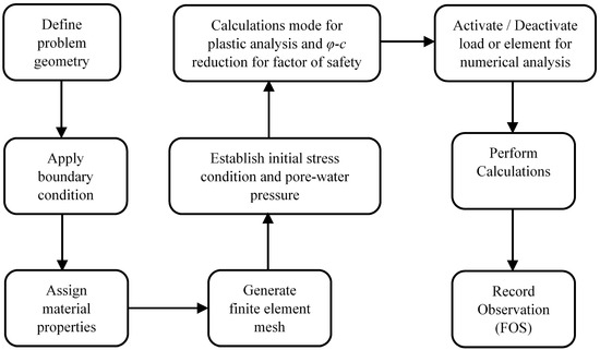 The shear strength and stiffness parameters, i.e., cohesion (c), angle of internal friction (ϕ), elastic modulus (E), and Poisson’s ratio (ν), were used for the numerical analysis, assuming Mohr–Coulomb constitutive behaviour is followed by the in-situ soil. The stress–deformation analysis and estimation of the safety factor through a strength reduction technique were an integral part of the numerical analysis, and the output of the results provided insight into the problem statement and potential future stability issues if they exist. The step-by-step procedure for the numerical analysis involved is depicted in Figure 4.