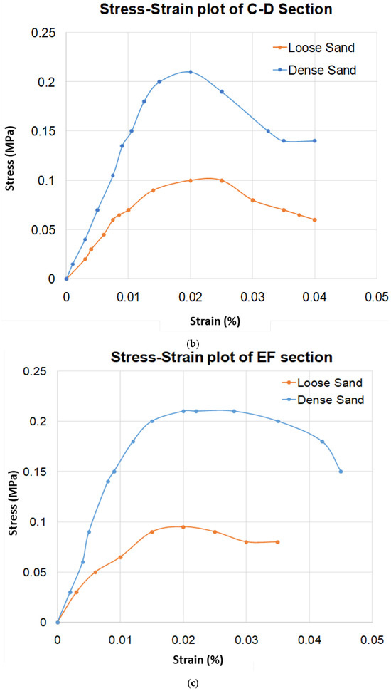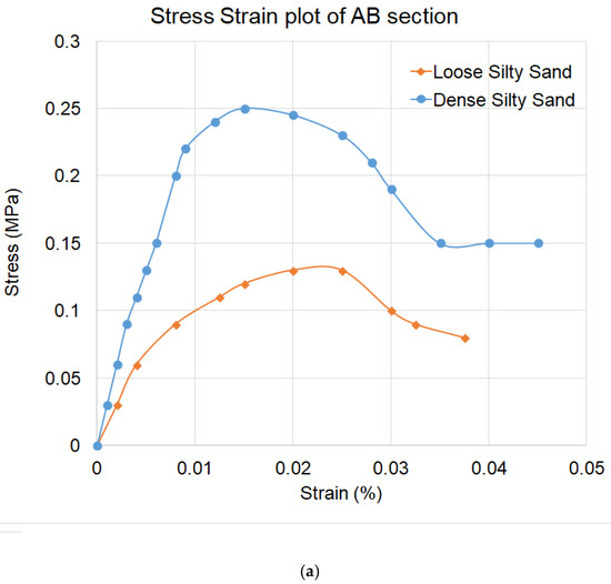 The analysis involved a detailed evaluation of the geotechnical properties of the dam materials and the structural behaviour of these dams under various conditions. The properties of the moraine sediment dams are summarised in Table 1, which provides a comprehensive overview of the geotechnical parameters for each dam. The stress–strain curves of the moraine sediment dam AB, CD, and EF sections are shown in Figure 5a–c. The upper sections of the moraine dams have a lower strength compared to the lower sections.