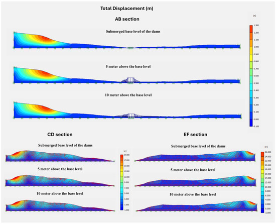 These displacement values reveal that dam AB exhibits significantly lower displacement compared to dams CD and EF across all water level scenarios. This suggests that dam AB has considerably higher stability and resistance to deformation under varying water levels. The relatively minor displacement of dam AB, even with a water level increase of 10 m, highlights its robustness and effectiveness in maintaining structural integrity despite rising water pressures. In contrast, the much larger displacements observed in dams CD and EF under similar conditions suggest that these dams are more susceptible to deformation and instability. Figure 6 illustrates that the total displacements for all three dams were quite similar across the different water level scenarios. This uniformity indicates that while the absolute displacements differ significantly between the dams, the relative impact of water level rise is consistent in terms of how it affects the overall stability of each dam. The similarity in displacement patterns across the scenarios emphasises that dam AB remains the most stable structure, while CD and EF show greater sensitivity to water level changes.