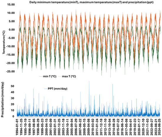 (Upper) Plot of daily minimum temperature and maximum temperature and (Lower) plot of daily precipitation (mm/day) for the period of January 1994 to June 2024.