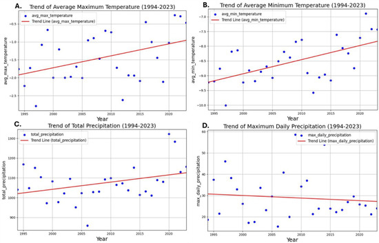 Plot of the (A) annual average of maximum daily temperature and trend, (B) annual average of minimum daily temperature, (C) yearly total precipitation, and (D) annual maximum daily precipitation for the period of 1994 to 2023.
