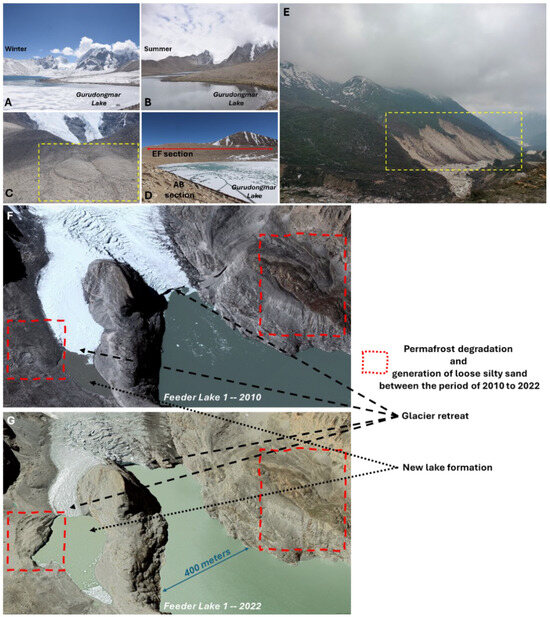 Gurudongmar Lake during winter (A) and summer (B); Solifluction of permafrost in the study area vicinity (C); Moraine dam section EF seen in the distance (D), photograph taken standing on section AB; Permafrost thaw and mass wasting at a lower elevation (E) and changes in the glacier status and permafrost in the Feeder Lake 1 vicinity (F,G).