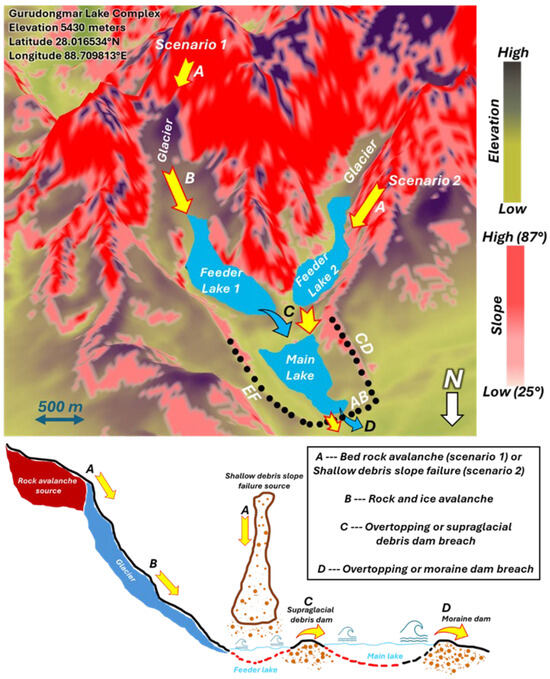 Elevation and slope of the Gurudongmar Lake area (ALOS-PALSAR DEM). Two possible scenarios: Scenario 1 of a rock and ice avalanche into the feeder lake (A and B) causing overtopping, affecting the stability of the supraglacial debris dam and frontal moraine dam (C and D), and Scenario 2 of a shallow debris slope failure into the feeder lake (A) leading to overtopping or failure of the supraglacial dam and moraine dam (C and D) (modified after Sattar et al., 2023 [56]).